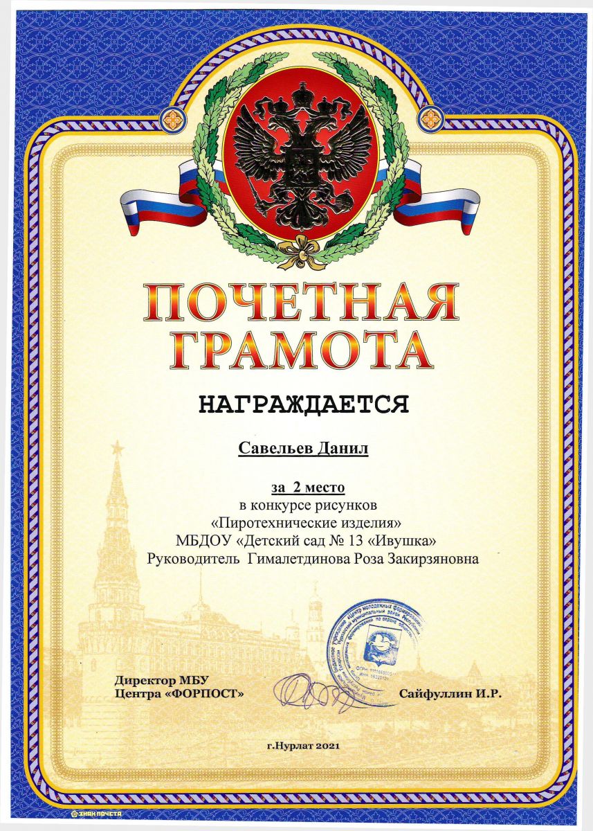 Грамота 2 место. С.Данил . Конкурс рисунков "Пиротехнические изделия"