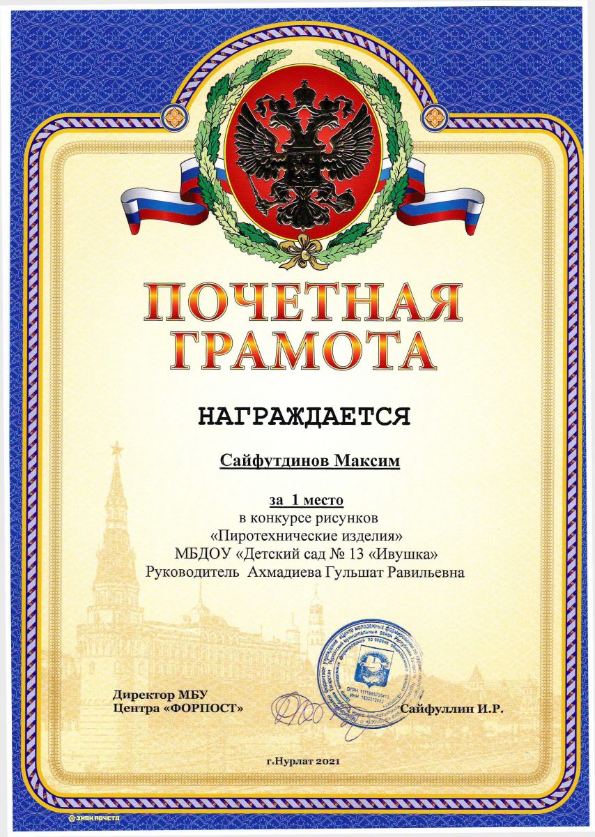 Грамота 1 место. С.Максим. Конкурс рисунков "Пиротехнические изделия"