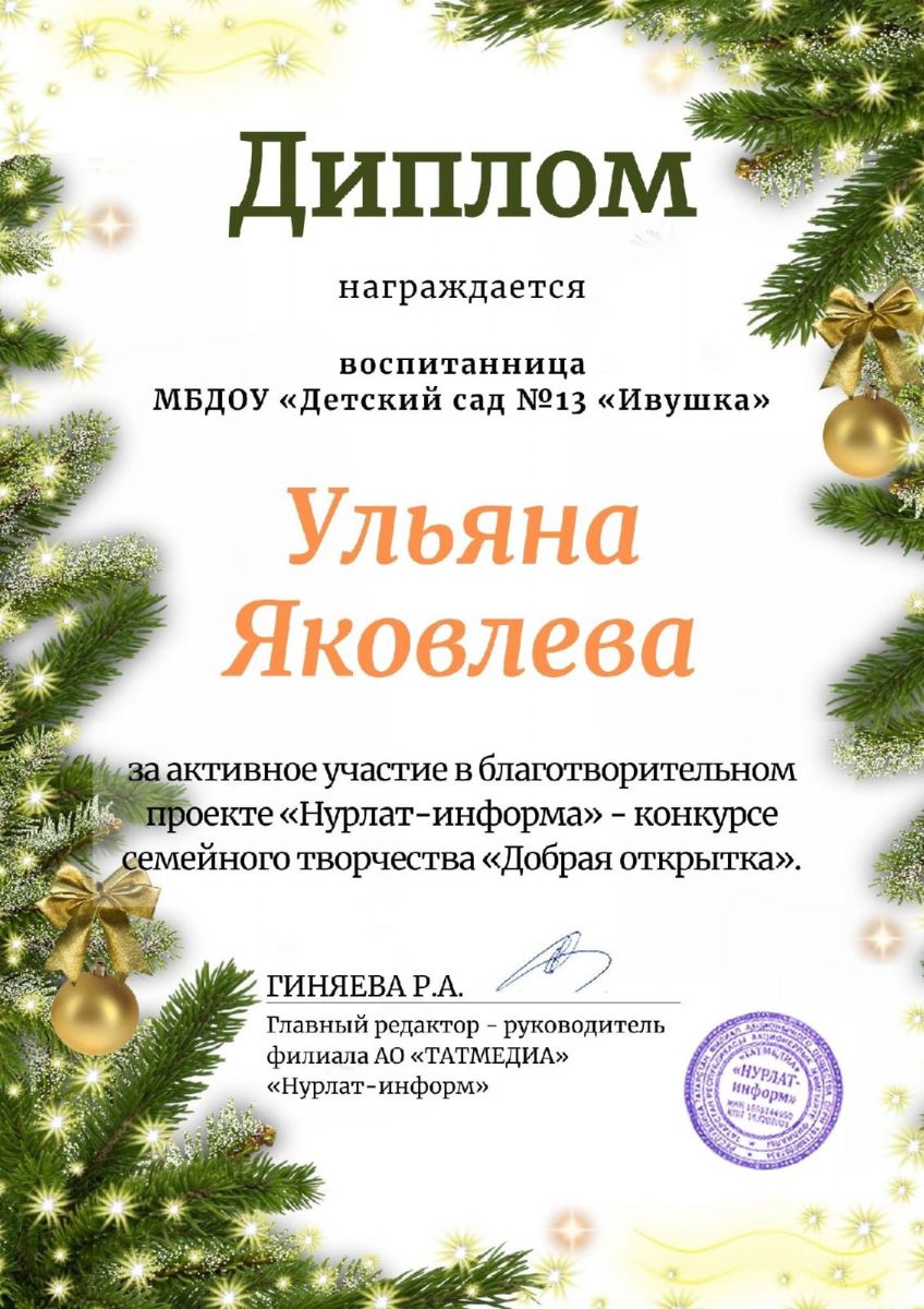 Диплом за активное участие в конкурсе семейного творчества "Добрая открытка" Ульяна Я.