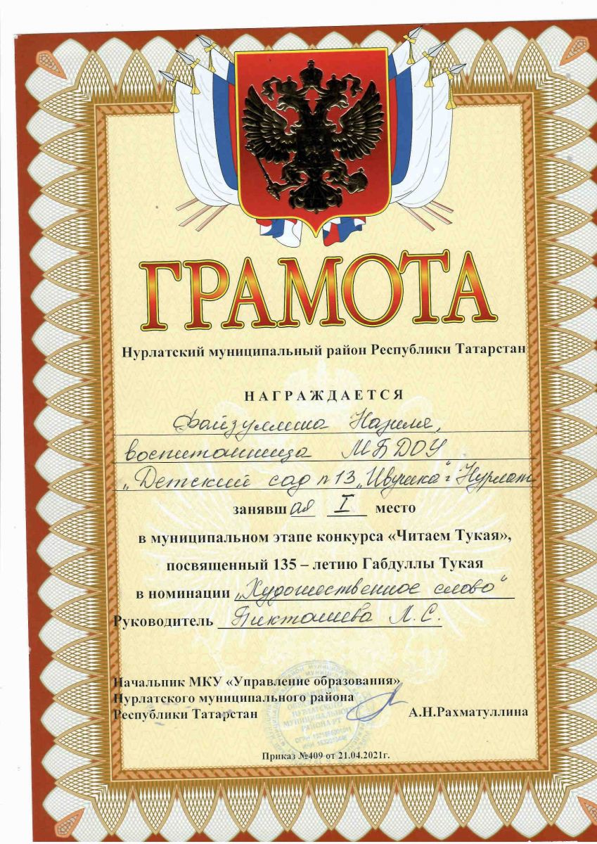 Грамота 1 место (Ф.Назиля) в муниципальном этапе конкурса "Читаем Тукая"