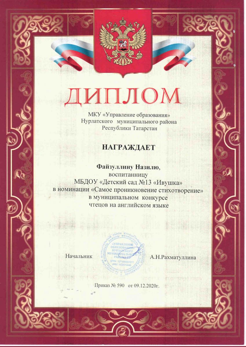Диплом. Муниципальный конкурс чтецов на английском языке. Файзуллина назиля.