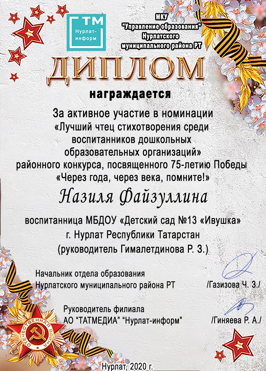 Диплом. Конкурс чтецов "Через года, через века, помните!" Файзуллина Назиля