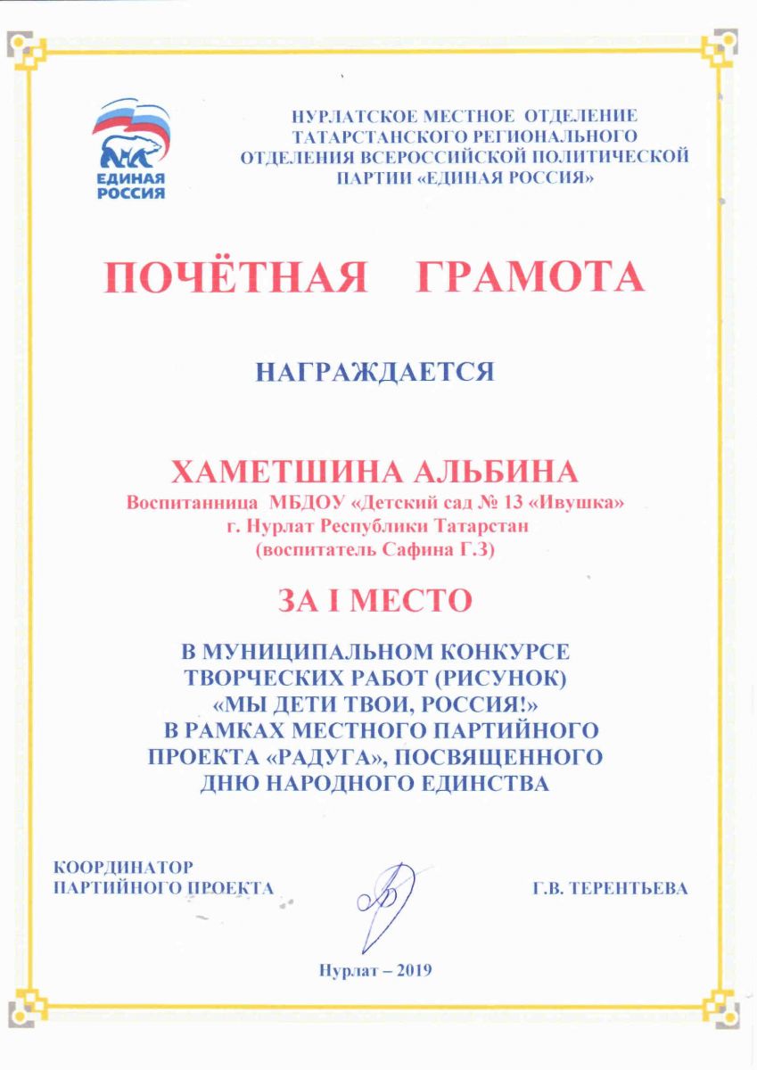 Грамота 1 место Хаметшина Альбина "Мы дети твои - Россия"