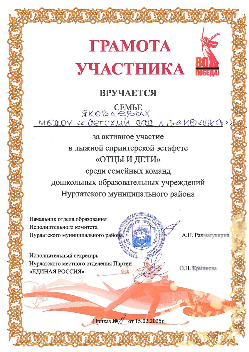 Грамота семье Яковлевых в лыжной спринтерской эстафете "Отцы и дети"