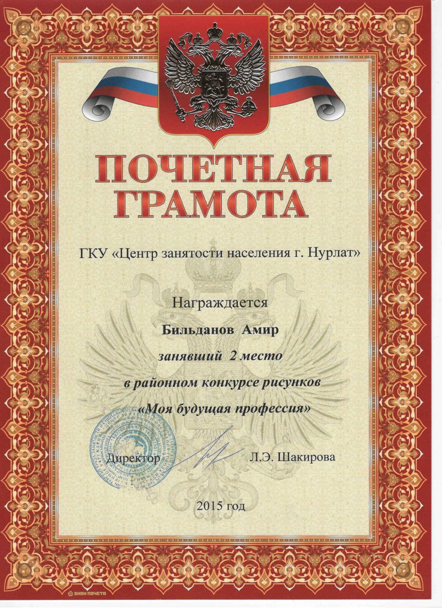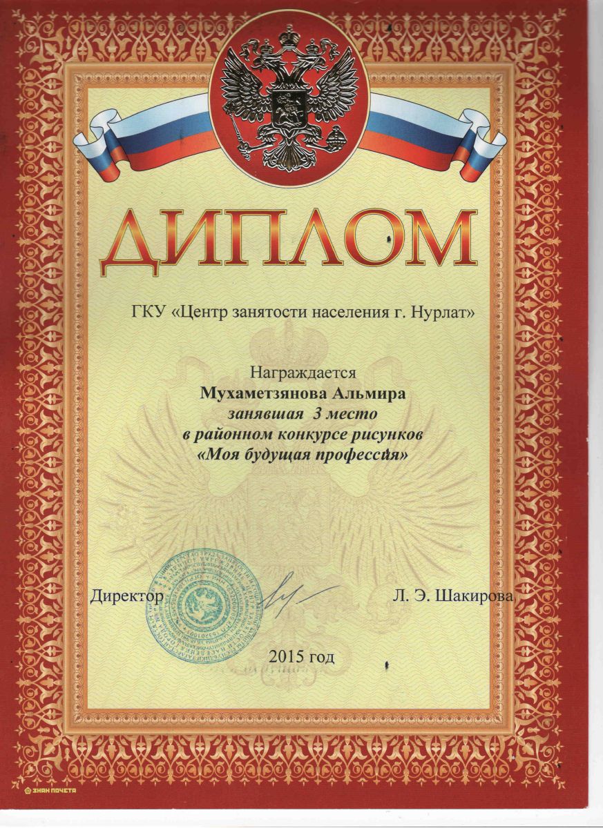 Диплом в районном конкурсе рисунков "Моя будущая профессия" (Бильданов Амир)