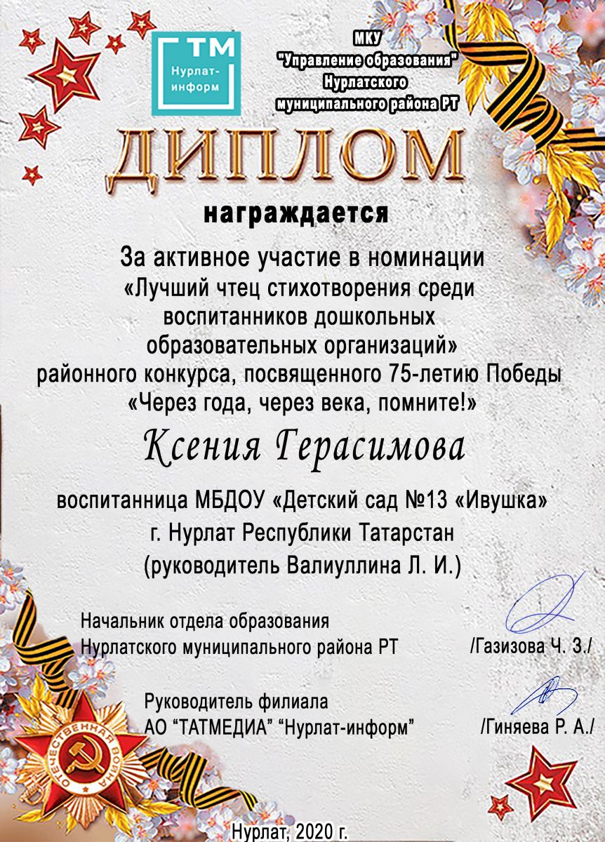 Диплом. Конкурс чтецов "Через года, через века, помните!" Герасимова Ксения