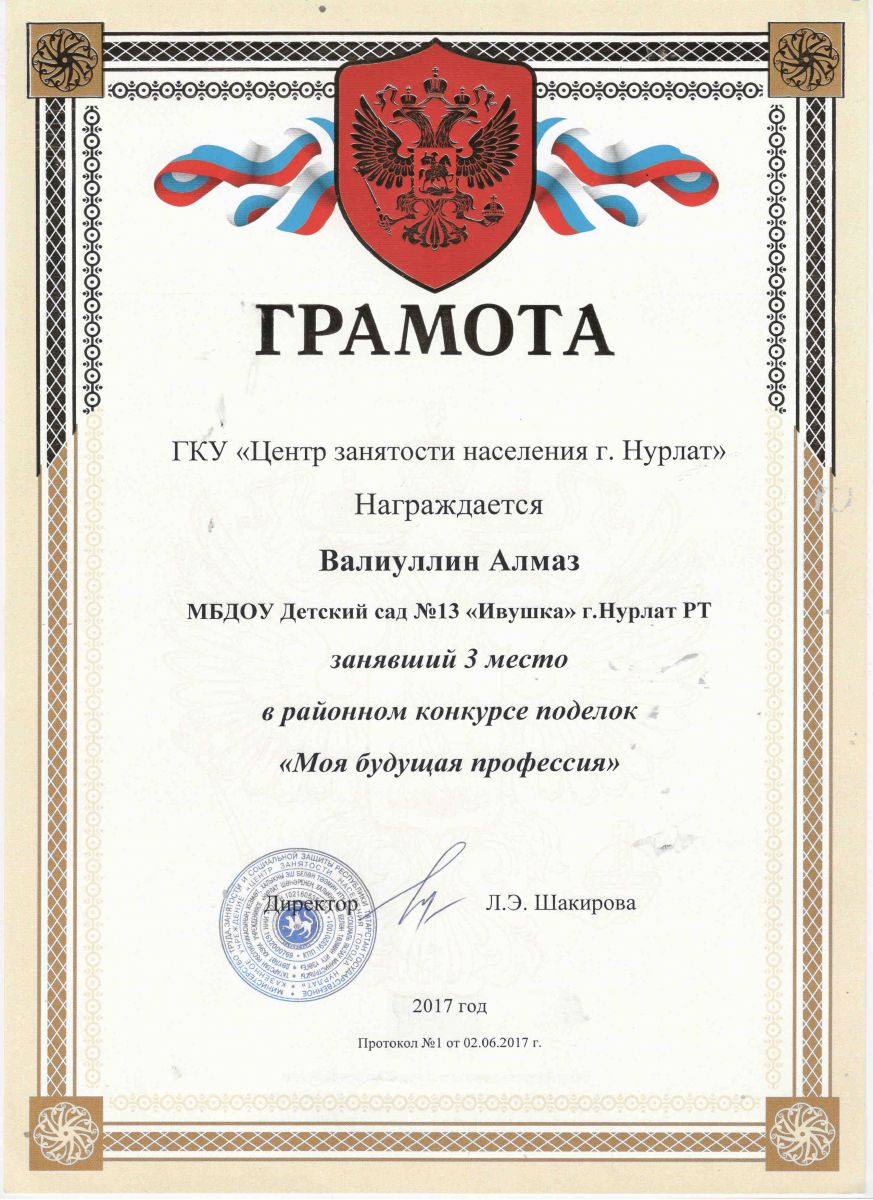 Грамота за 3 место в районном конкурсе "Моя будущая профессия" (Валиуллин Алмаз)