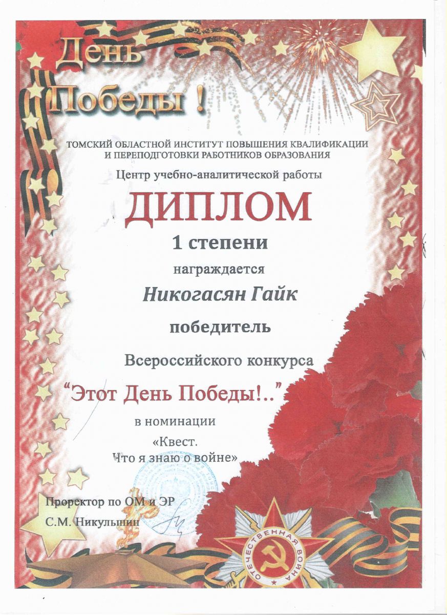 Диплом 1 степени во всероссийском конкурсе "Этот День Победы" (Никогосян Гайк)