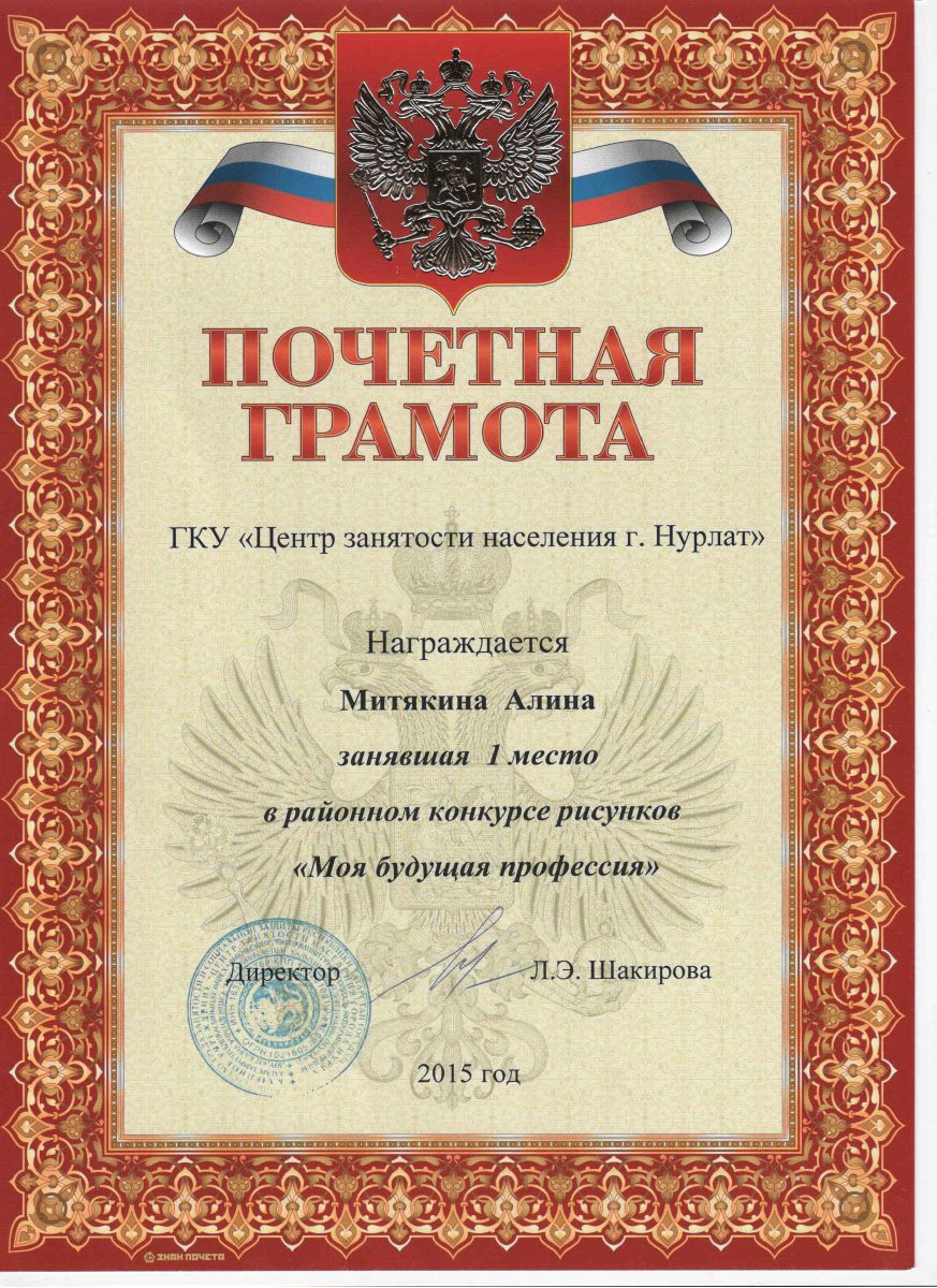 Диплом в районном конкурсе рисунков "Моя будущая профессия" (Митякина Алина)