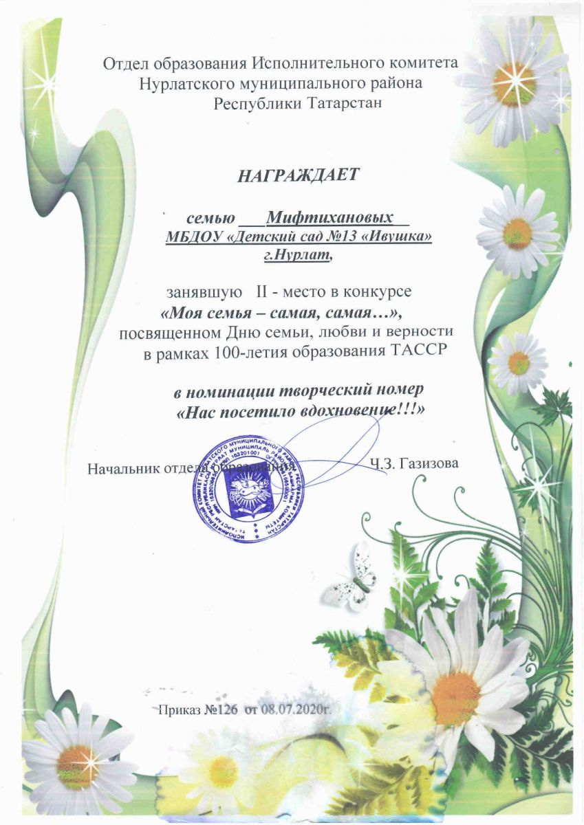 Диплом 2 место в конкурсе "Моя семья - самая, самая". Семья Мифтихановых.