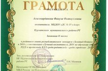 Воспитатель первой квалификационной категории Асылмарданова Фануза Фатхулловна заняла II место на районном этапе республиканского конкурса "Зеленый огонек" в 2016г. в номинации "Лучший воспитатель ДОУ по обучению детей ПДД и пропаганде БДД среди родителей" среди городских ДОУ.