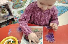Сегодня на кружковом занятии "Говорящие пальчики" в 1 младшей группе "Б" дети провели массаж пальчиков с помощью бусиков из крышек, раскрашивали варежки с помощью нетрадиционного метода "ватной палочкой" и смастерили аппликацию "Греем мишку".