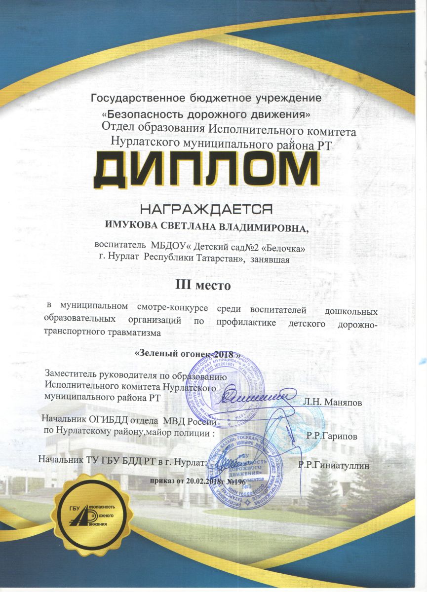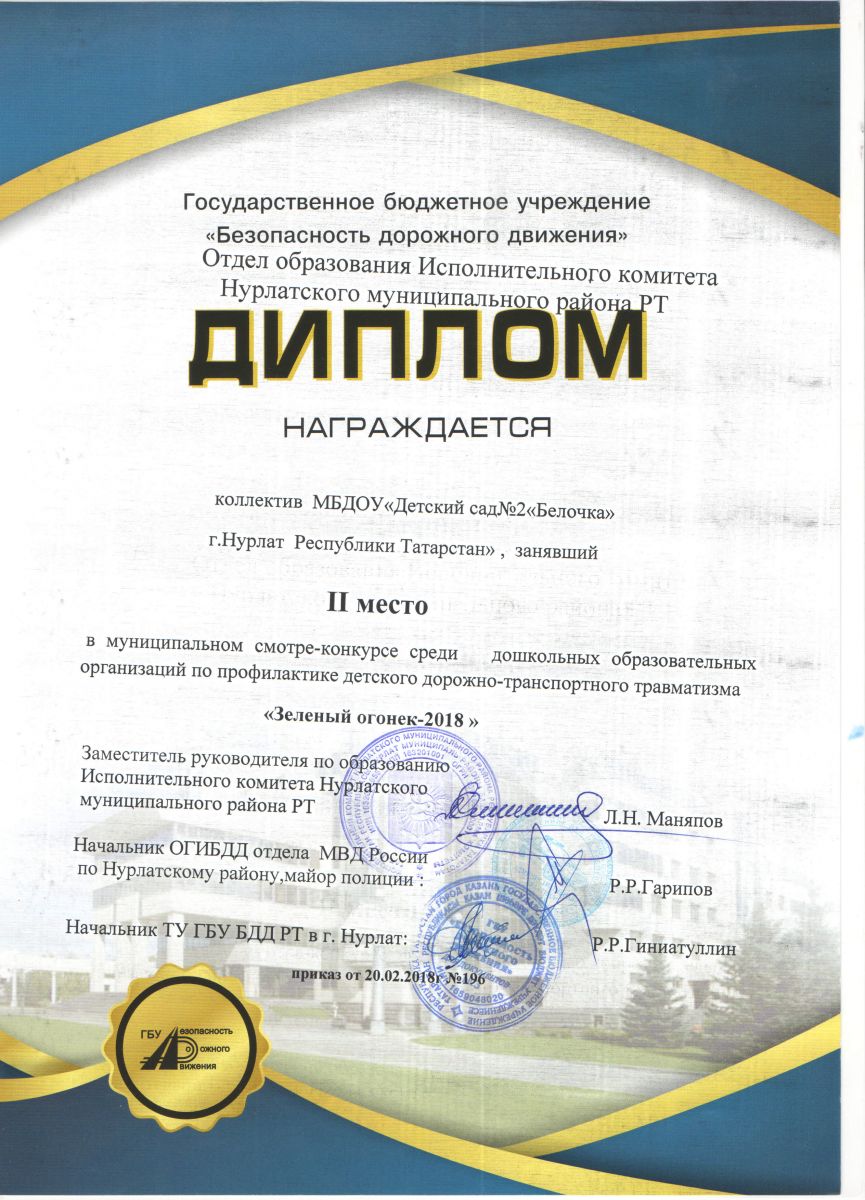 Опубликовано: 22.02.2018В феврале проходил муниципальный этап смотра-конкурса среди воспитателей и дошкольных образовательных организаций Нурлатского муниципального района.Республики Татарстан по профилактике детского дорожно-транспортного травматизма «Зеленый огонек» Наш детский сад был представлен в двух номинациях и занял призовые места: