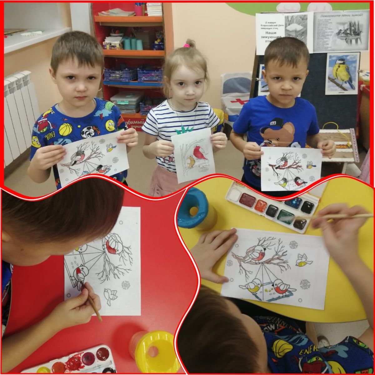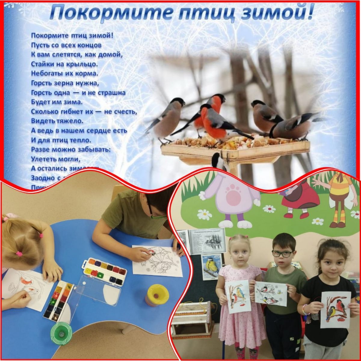 Ел саен 15 гыйнварда "Кышлаучы кошлар көне" Бөтенроссия экологик бәйрәме үткәрелә. Тәрбиячеләр, өлкән төркем балалары белән берлектә, бу көнгә багышланган төрле чаралар үткәрделәр. Җәяү йөргәндә балалар җимлек янына килгән кошларны күзәттеләр, балалар белән тулган бөртекләрне яла ягтылар. Төркемдә тәрбиячеләр "Кышын кошларны ашатыгыз" дигән темага әңгәмә уздырдылар, "Тасвирлама буенча уйлан" дидактик уены уйнадылар, балалар "Кышлаучы кошлар" темасына буяулар буядылар.