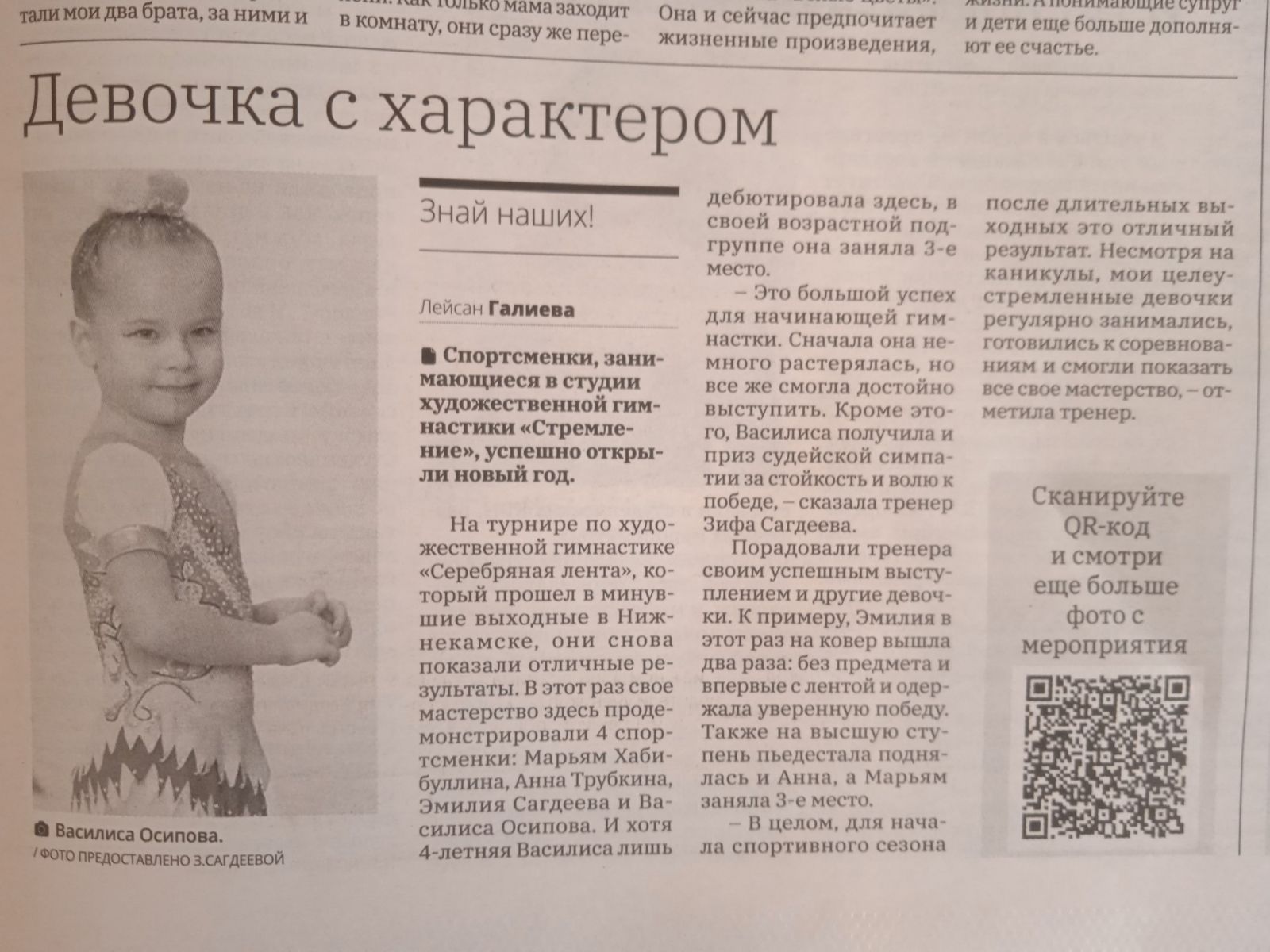 Узган ял көннәрендә Түбән Камада узган нәфис гимнастика буенча «Көмеш тасма» турнирында безнең тәрбияләнүче Осипова Василиса катнашты. 4 яшьлек Василиса өчен бу дебют ярышлары булса да, ул үзенең яшь төркемендә өченче урында. Котлыйбыз сәламәтлек һәм алдагы ярышларда уңышлар телибез.