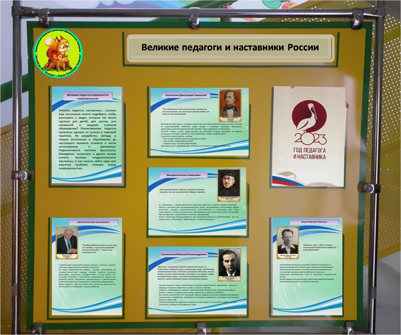 Опубликовано: 24.08.2023В рамках Года педагога и наставника в детском саду прошли тематические мероприятия с педагогами на тему «Выдающиеся педагоги и наставники». Учителя и наставники — это основа любого общества. Какие нравственные основы заложит, каким навыкам обучит педагог своего воспитанника, таким он и будет. Педагоги вспомнили о великих педагогах и наставниках. Времена меняются, на смену прежним методам преподавания приходят новые технологии. Но главная цель остаётся прежней — воспитать яркую целеустремлённую личность, способную широко мыслить и принимать самостоятельные решения. Также был оформлен стенд «Великие педагоги и наставники России». Фото