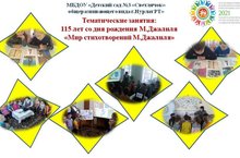 15 февраля в ДОУ прошли тематические занятия "Мир стихотворений М.Джалиля", посвященные 115-летию со дня рождения М.Джалиля. Воспитанники познакомились с жизнью и творчеством поэта, сборником "Моабитская тетрадь". / 15 нче февраль көнне балалар бакчасында М.Җәлилнең тууына 115 ел тулуга багышланган "М. Җәлил шигырьләре дөньясы" дип исемләнгән тематик дәресләр узды. Тәрбияләнүчеләр шагыйрьнең тормыш юлы һәм иҗаты, "Моабит дәфтәре"җыентыгы белән таныштылар.
