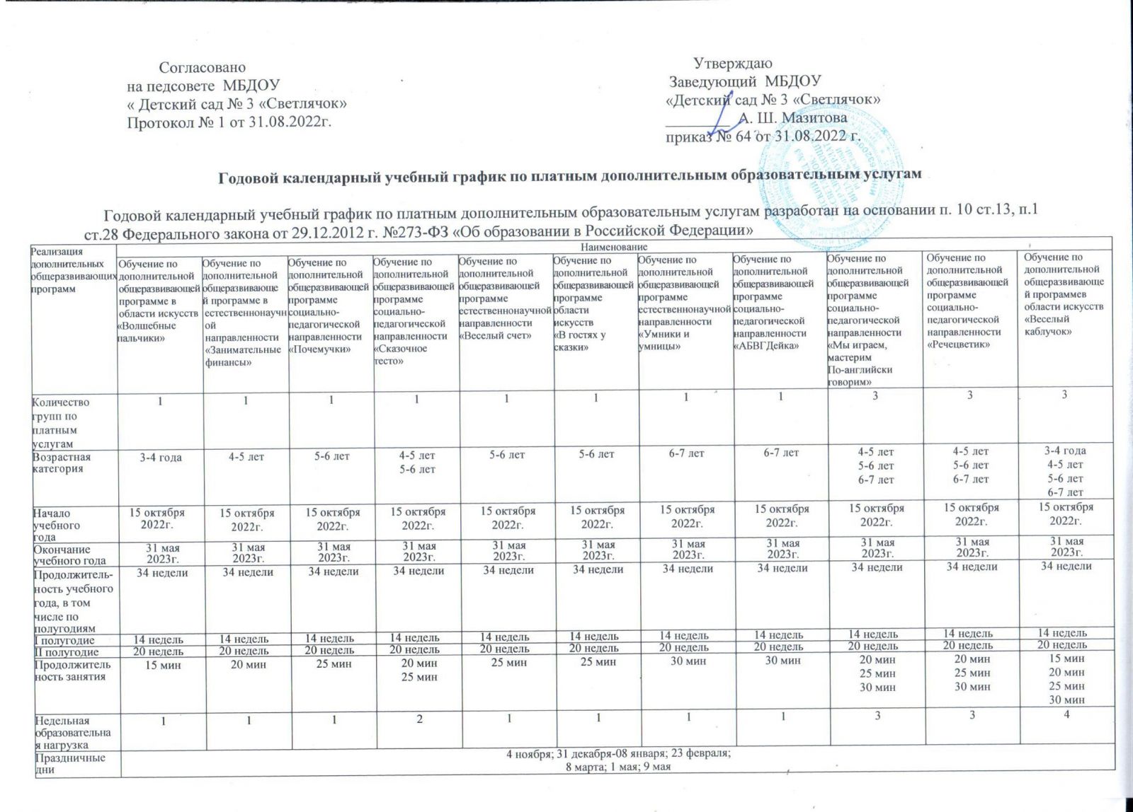 Годовой календарный график по дополнительным образовательным услугам на 2021 - 2022 учебный год.