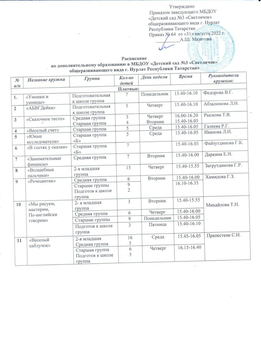 Расписание по дополнительному образованию на 2022 -2023 учебный год