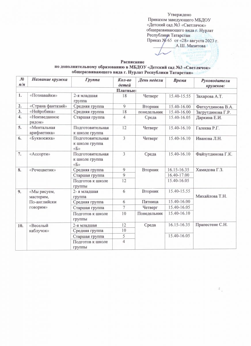 Расписание по дополнительному образованию на 2023-2024 учебный год