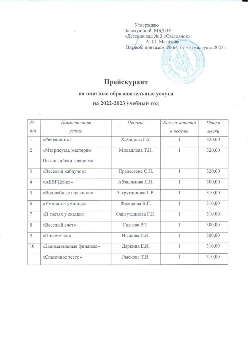 Прейскурант по дополнительным услугам на 2022-2023 учебный год