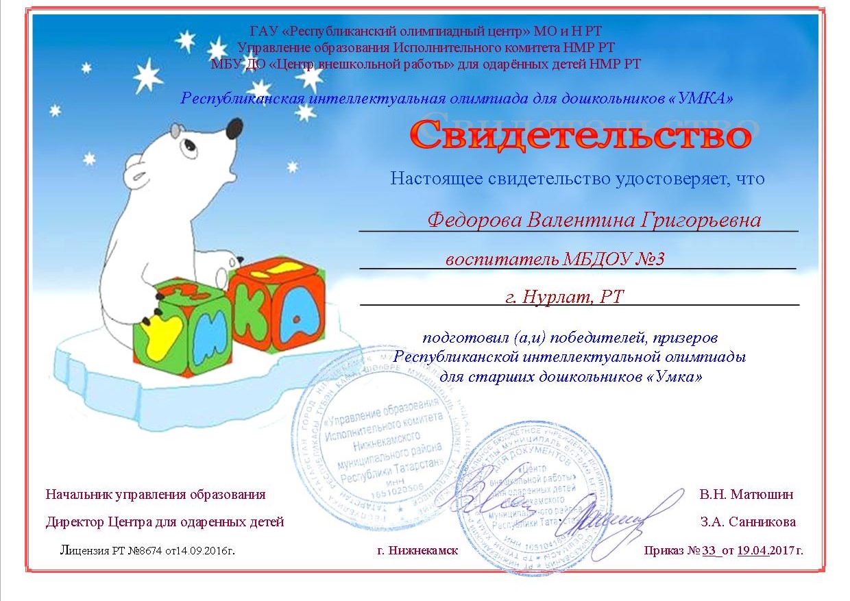 Валентина Григорьевна Федорова - воспитатель- подготовила призёров олимпиады УМКА