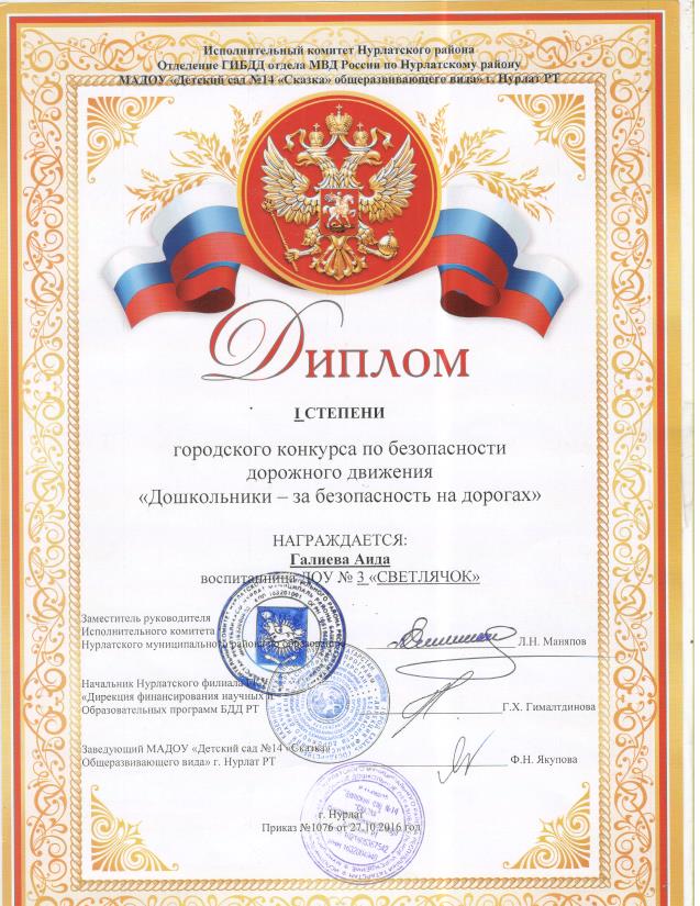 Диплом 1 степени в конкурсе города « Дошкольники– за безопасность на дорогах» - Галиева Аида; 2016г/ «Мәктәпкәчә яшьтәге балалар – юлларда иминлек өчен » исемле шәһәр конкурсында Гәлиева Әидә 2016 елны 1 дәрәҗә дипломына лаек булды