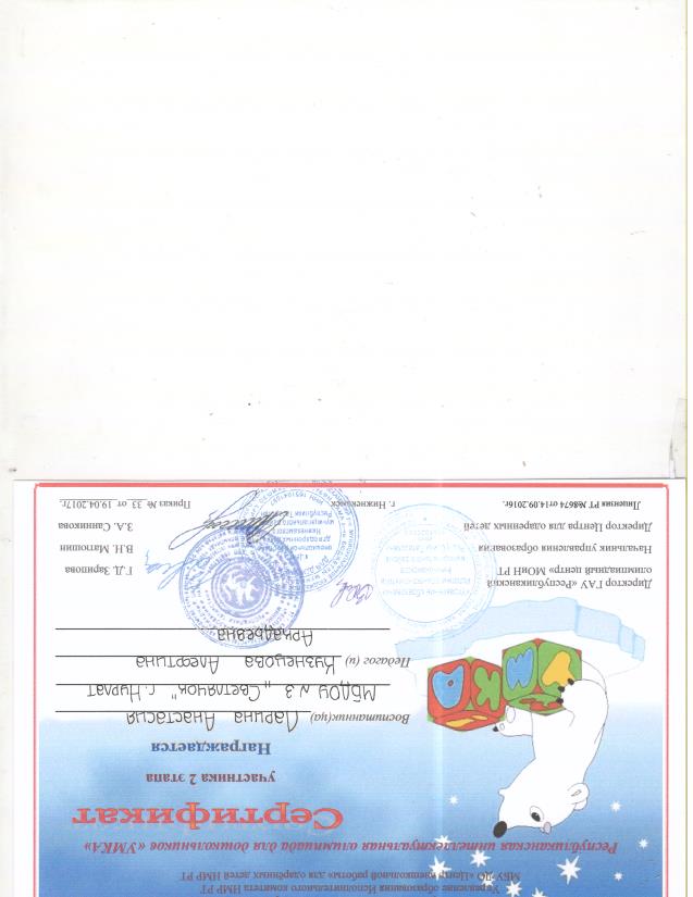 Диплом участника 2 этапа республиканского конкурса "УМКА" - Ларина Анастасия; 2017г. / 2017 елның 2-нче этап Республика "УМКА" конкурсында катнашучы дипломына - Ларина Анастасия лаек булды
