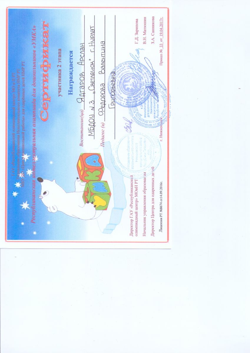 Диплом участника 2 этапа республиканского конкурса "УМКА" - Ядгаров Арслан; 2017г. / 2017 елның 2-нче этап Республика "УМКА" конкурсында катнашучы дипломына - Ядгаров Арслан лаек булды