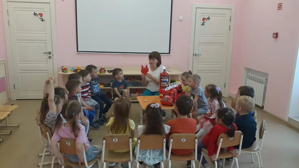 Балалар белән янгын куркынычсызлыгы кагыйдәләре турында әңгәмә үкәрелде.