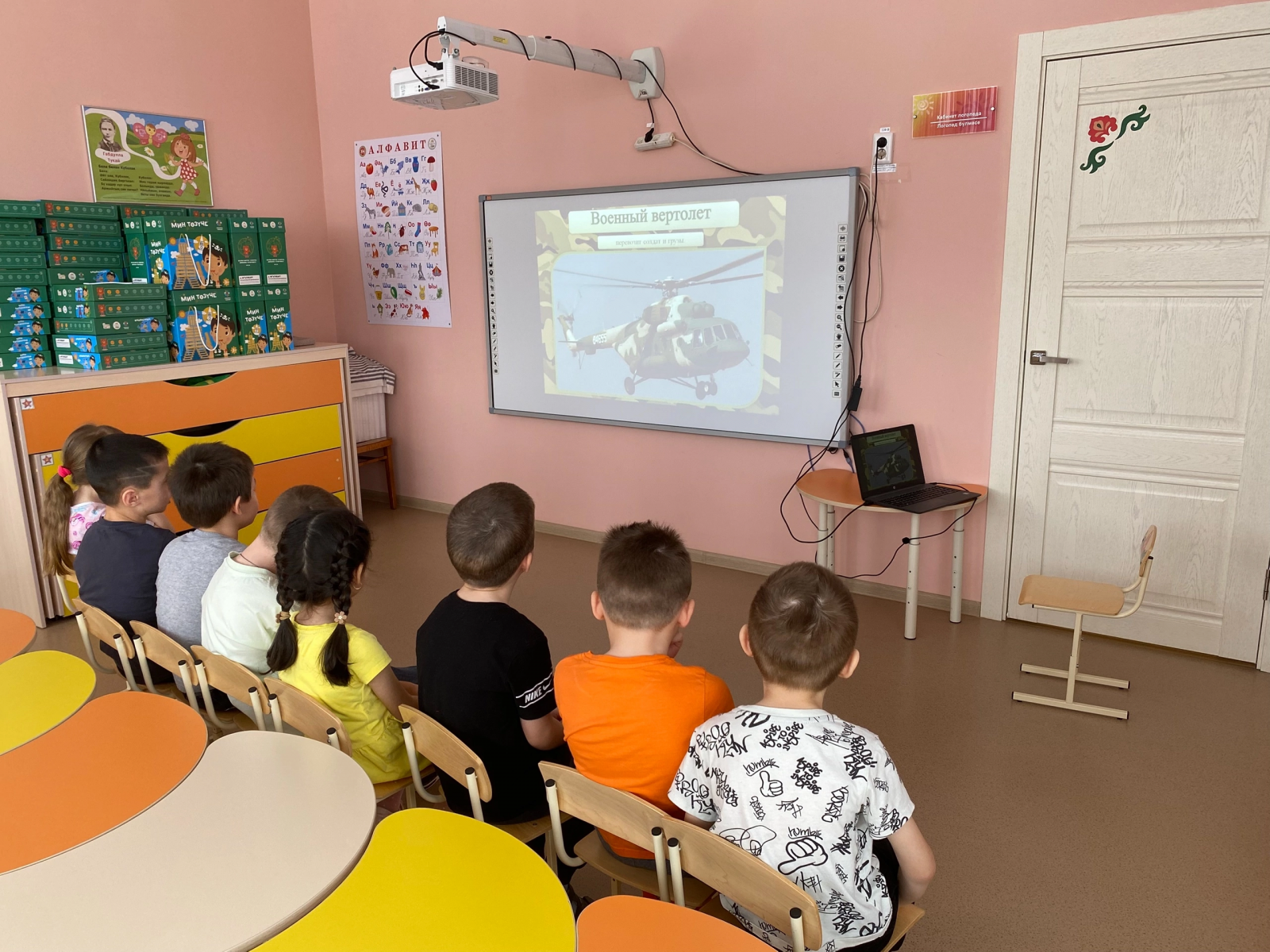 Гражданлык тәрбияләү айлыгы кысаларында мәктәпкә әзерлек төркемендә «Хәрби техника» темасына интерактив такта кулланып дәрес узды. Егетләр хәрби техника турындагы белемнәрен киңәйттеләр һәм "Нәрсә артык?» дигән ИКТ уен уйнадылар. Максат: балаларның армия турында белемнәрен киңәйтү, гаскәр төрләре, Ватанны саклаучылар турында күзаллауларын формалаштыруны дәвам итү һәм балаларны хәрби техника белән таныштыру. Ватанга мәхәббәт, армия өчен горурлык хисләре тәрбияләү.