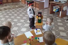 В группу раннего развития сегодня приходил "инспектор ГИБДД" проверить знания по правилам дорожного движения. Дети в игровой форме показали свои знания. Потом с воспитателем провели занятие по аппликации " Светофор".