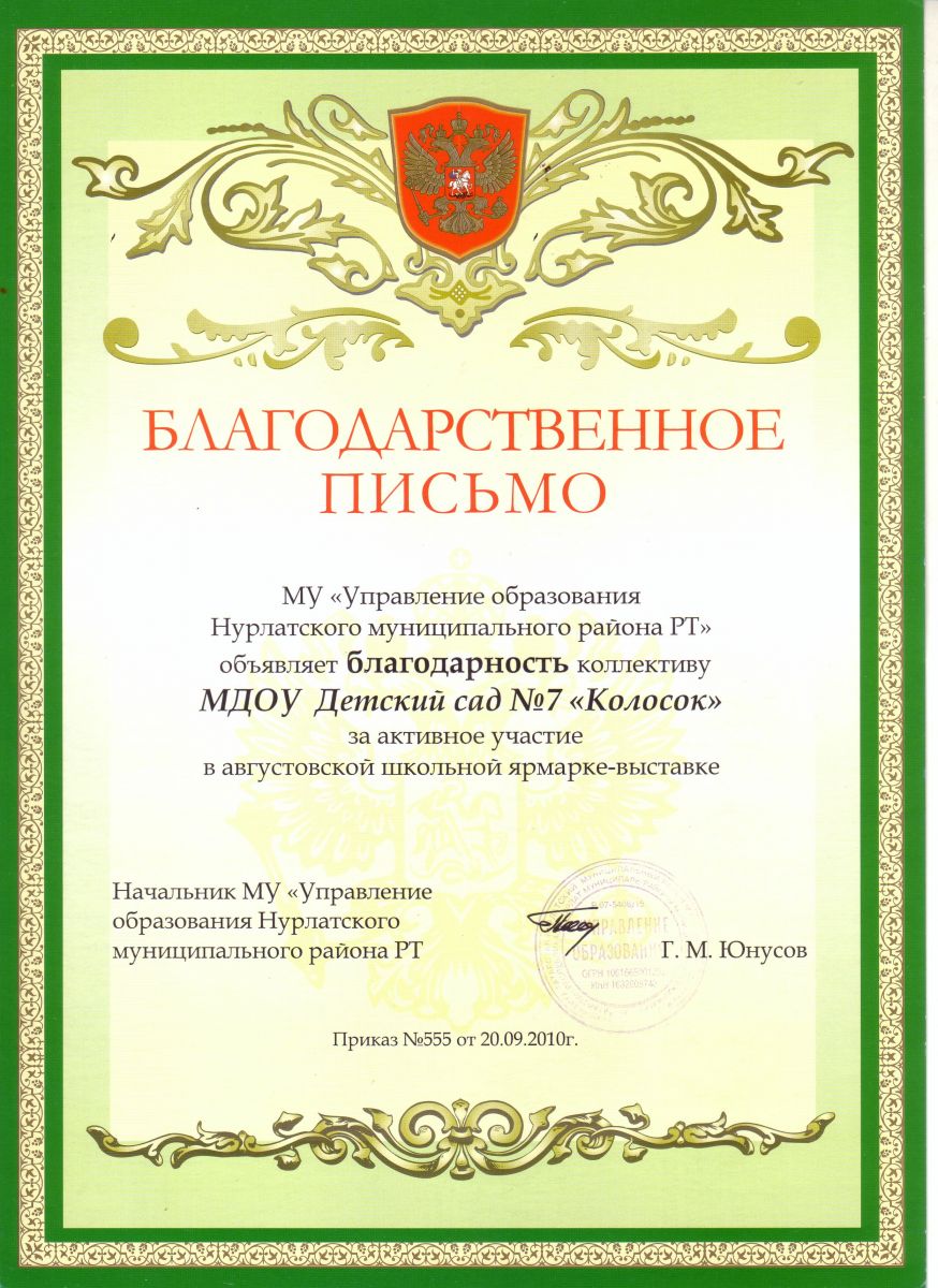 Благодарственное Письмо от МУ "Управления Образования Нурлатского муниципального района РТ" за активное участие в августовской школьной ярмарке-выставке, 2010 год.