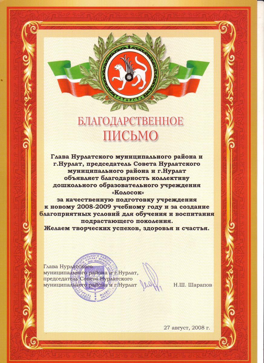Благодарственное письмо от Главы Нурлатского муниципального района и г.Нурлат за качественную подготовку учреждения к новому 2008-2009 учебному году и за создание благоприятных условий для обучения и воспитания подрастающего поколения, 2008 год.