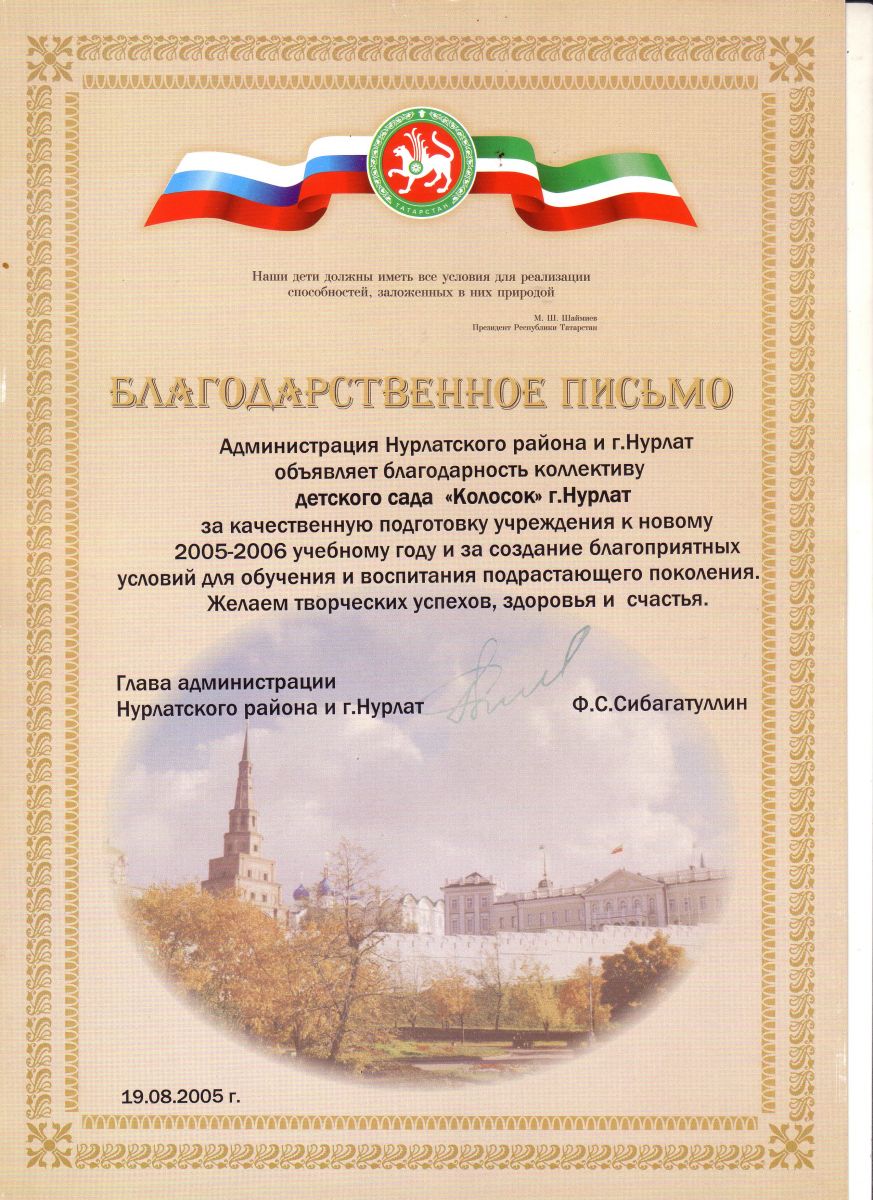 Благодарственное письмо от администрацииНурлатского района и г.Нурлат коллективу Детского сада "Колосок" за качественную подготовку учреждения к новому 2005-2006 учебному году и за создание благоприятных условий для обучения и воспитания подрастающего поколения.