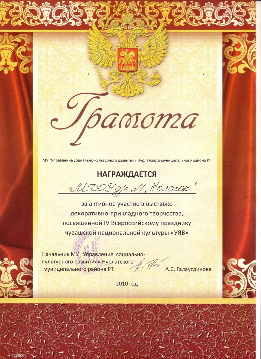 Грамота от МУ "Управление социально-культурного развития" Нурлатского муниципального района РТ за активное участие в выставке декоративно-прикладного творчества, посвященный IV Всероссийскому празднику чувашской национальной культуры "УЯВ", 2010 год.
