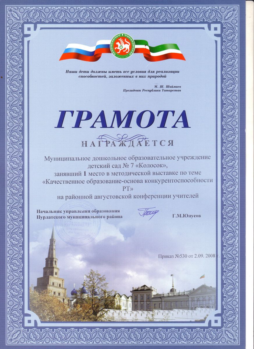 Грамота за занявшее 1 место в методичской выставке по теме "Качественное образование - основа конкурентоспособности РТ", 2008 год.