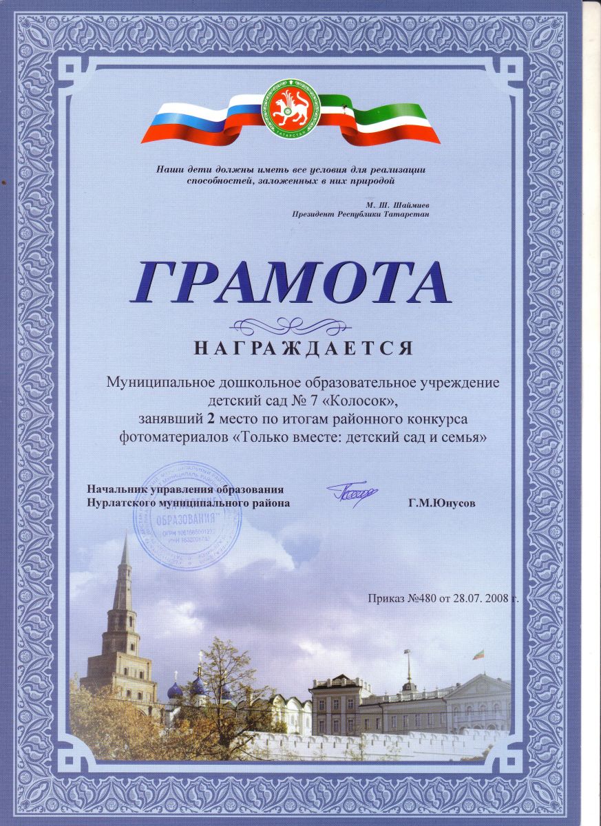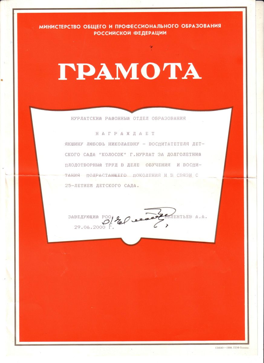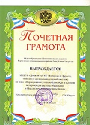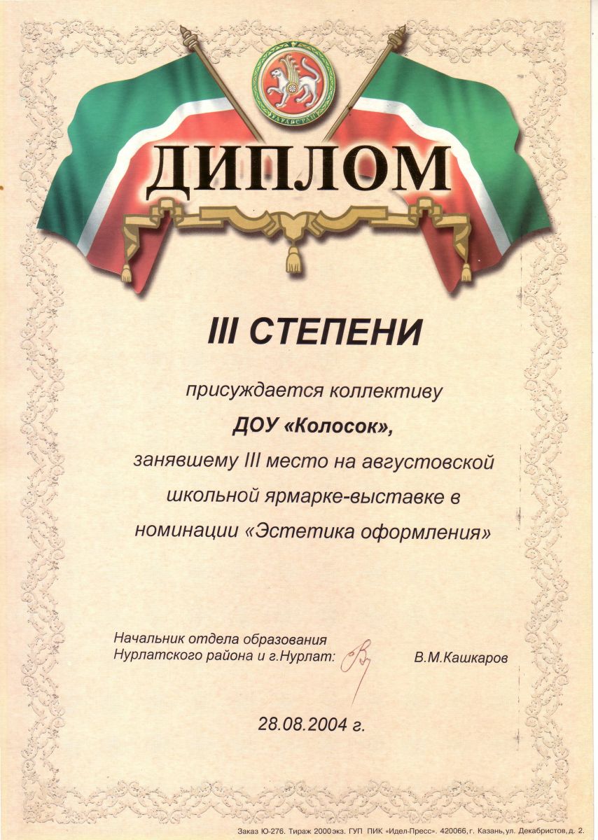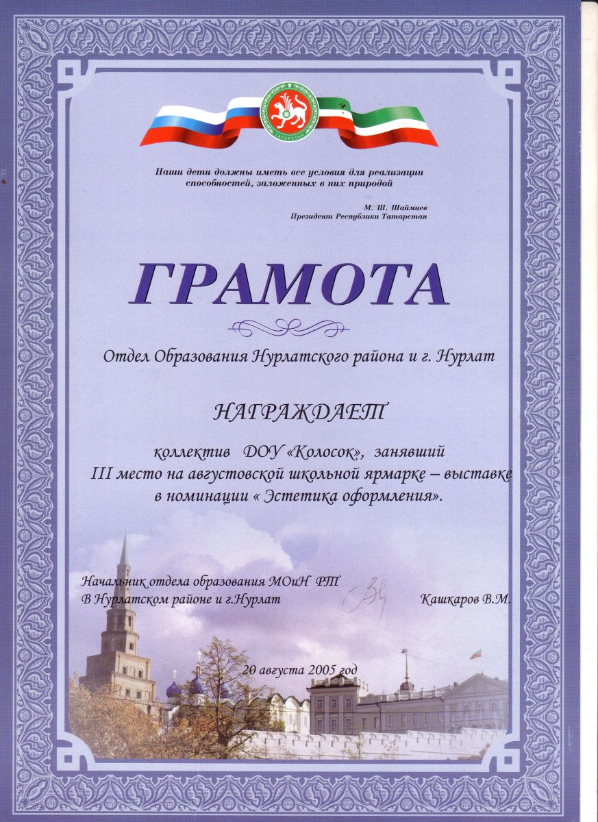 Грамота от Отдела Образования Нурлатского района и г.Нурлат коллективу ДОУ "Колосок", занявший 3 место на августовской школьной ярмарке-выставке в номинации "Эстетика оформления", 2005 год.