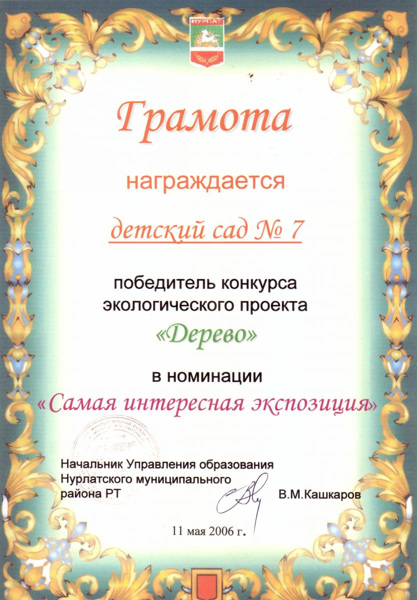 Грамота за победу в конкурсе экологического проекта "Дерево" в номинации "Самая интересная экспозиция", 2006 год.