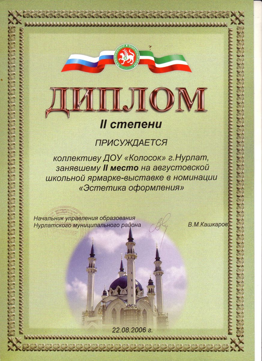 Диплом II степени присуждается коллективу ДОУ "Колосок" г.Нурлат, занявшему 2 место на августовской школьной ярмарке-выставке в номинации "Эстетика оформления", 2006 год.