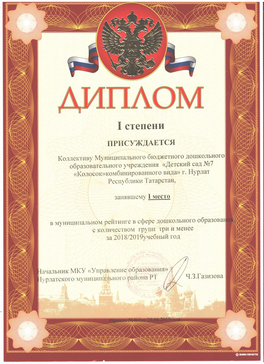 Диплом I степени в муниципальном рейтинге в сфере дошкольного образования с количеством групп три и менеее за 2018/2019 учебный год
