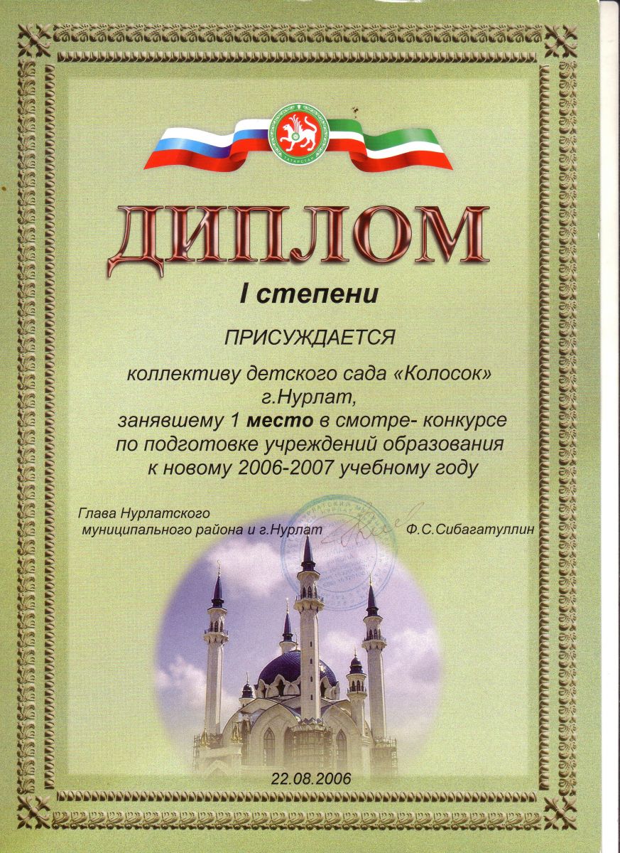 Диплом I степени присуждается коллективу детского сада "Колосок" г.Нурлат занявшеу 1 место в смотре-конкурсе по подготовке учреждений образования к новому 2006-2007 учебному году.