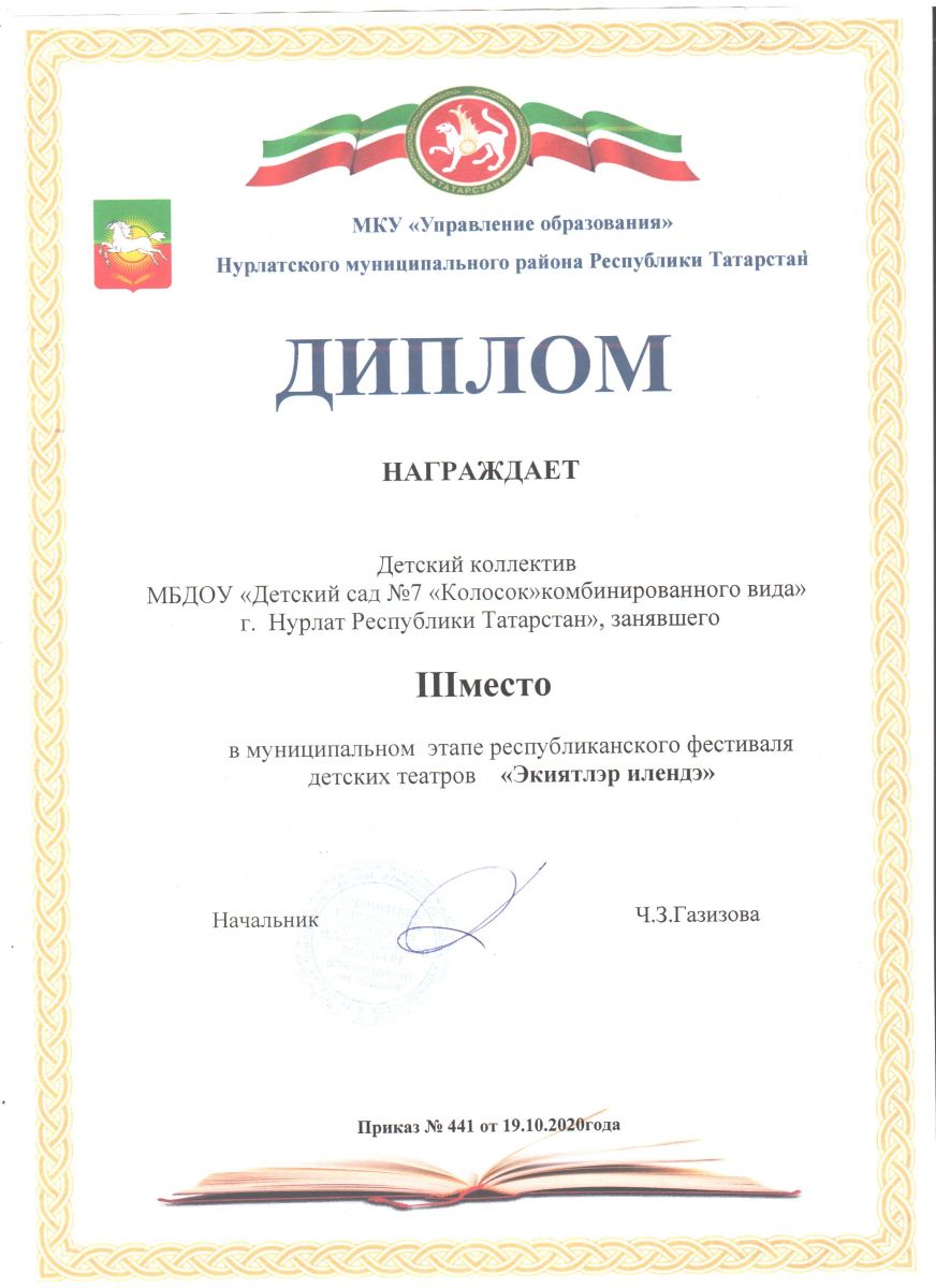Диплом за III место в муниципальном этапе республиканского фестиваля детских театров "Экиятлэр илендэ" Приказ №441 от 19.10.2020г.