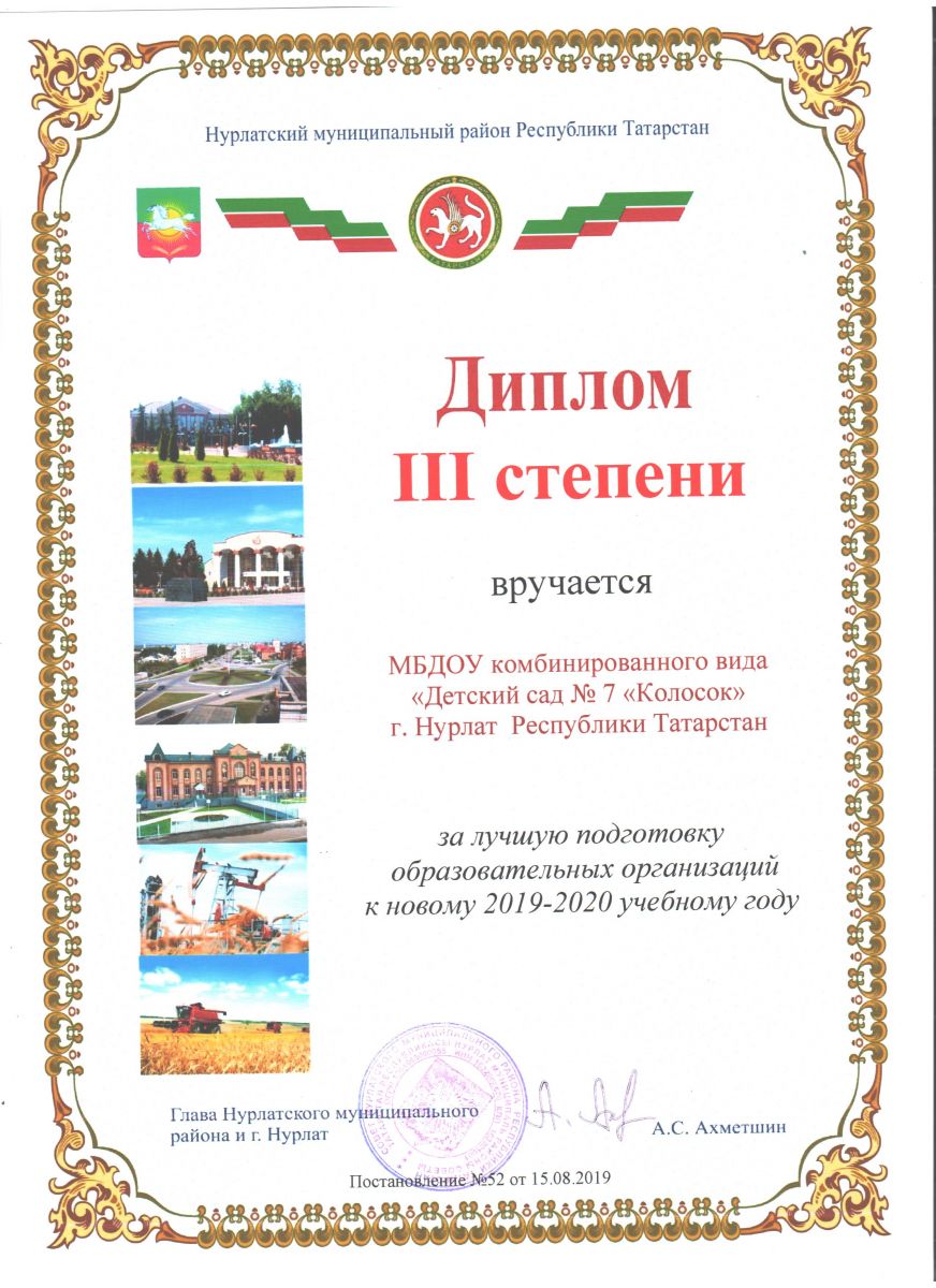 Диплом III степени за лучшую подготовку образовательных организаций к новому 2019-2020 учебному году. Постановление №52 от 15.08.2019г.