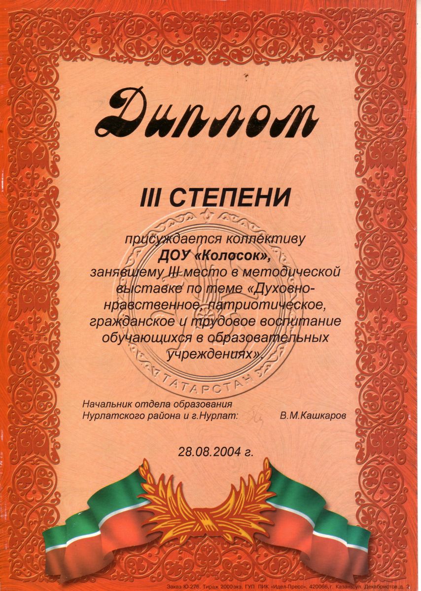 Диплом III степени присуждается коллективу ДОУ "Колосок", занявшему 3 место в методической выставке по теме "Духовно-нравственное, патриотическое, гражданское и трудовое воспитание обучающихся в образовательных учреждениях", 2004 год.