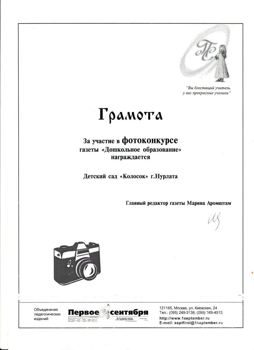 Грамота за участие в фотоконкурсе газеты "Дошкольное образование".