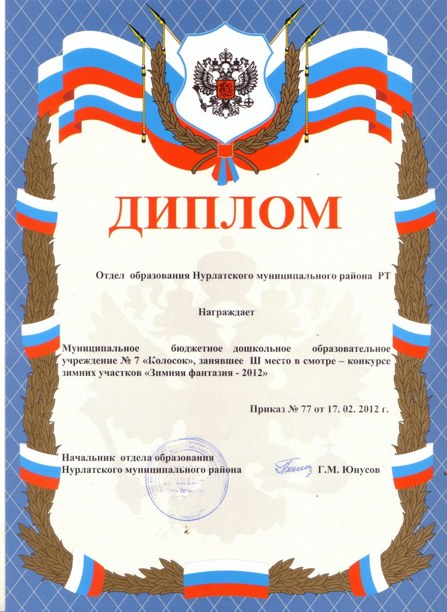 Диплом занявшее 3 место в смотре- конкурсе зимних участков