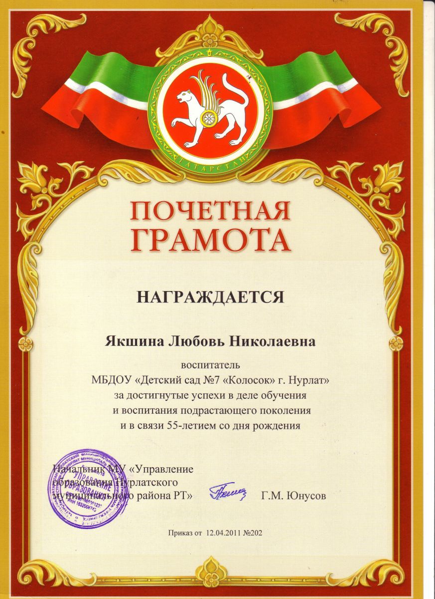 Почётная грамота от Отдела образования Исполнительного Коммитета Нурлатского муниципального района РТ, за занявшее I место в методической выставке по теме: "Формирование успешной личности в условиях модернизации системы образования в Нурлатском муниципальном районе", 2012 год.