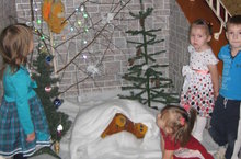 В фойе детского сада воспитатели украсили новогодний уголок, который напоминает детям о приближении сказки. Это зимний лес, где в берлоге маленький медвежонок спит сладким сном, а лесные зверята спрятались под елкой и ждут праздника.