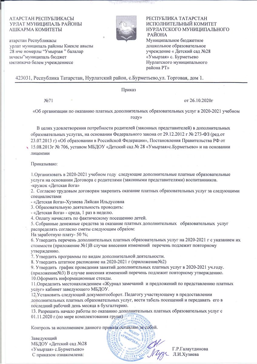 Приказ об организации по оказанию платных образовательных услуг/Түләүле белем бирү хезмәтләре күрсәтү турында боерык